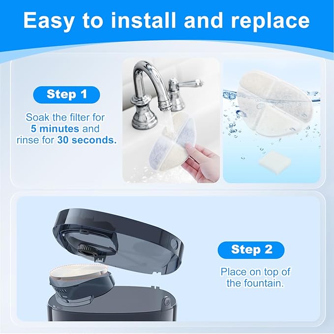 - REPLACEMENT: Soak the filter for 5 minutes and rinse for 30 seconds before use. We recommended replacing the filters every 2 weeks. If you have multiple pets, please clean the fountain and change the filter more often