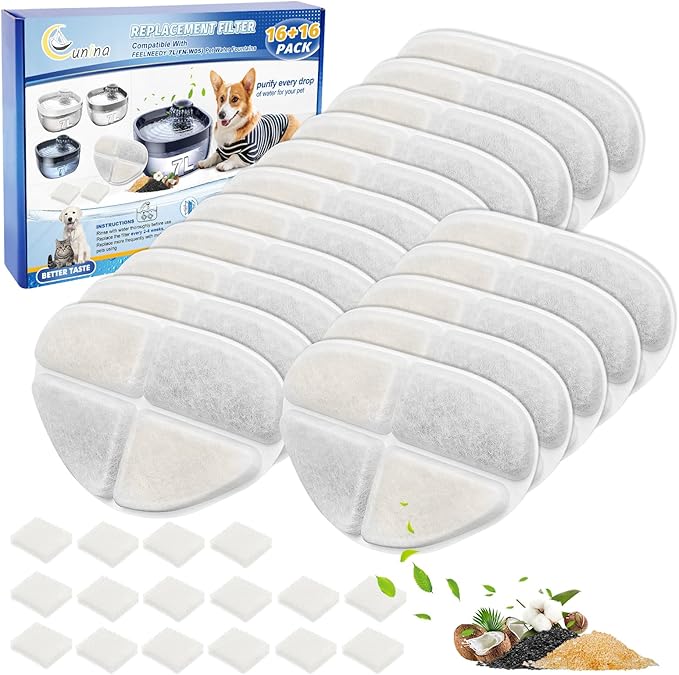 - VALUE PACKS: Include 16 packs of pet fountain replacement filters and 16 packs of replacement pump filter sponge compatible with feelneedy cat water fountain, satisfy your needs for long-time use