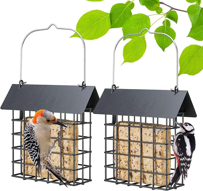 - Robust Materials: The outdoor suet bird feeder is designed for repeated use and features a rust-resistant coated metal, a waterproof roof, and a hanging wire. Our outdoor suet feeder is suitable for your feathered friends such as chickadees, sparrows, nuthatches, and woodpeckers.