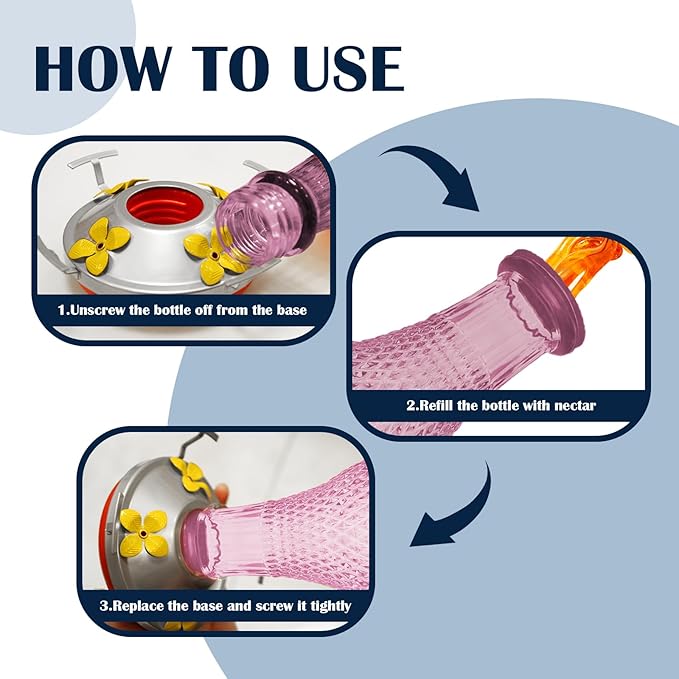 - PACKAGE INCLUDED: 1 pack glass hummingbird feeder, 1 pack ant moat, 1 pack metal hook, and 1 cleaning brush,can meet your daily needs easily.