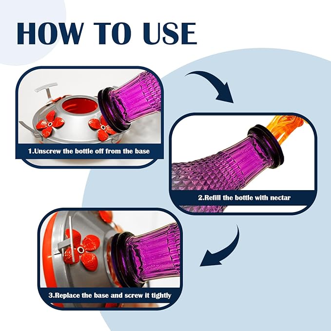 - Easy to fill and clean:The gradient from red base to transparent wide-mouth is designed to convenient monitoring of the nectar level,filling nectar timely and ensuring a continuous food source for hummingbirds.Holds up to 17 OZ of nectar at most.Wide mouth for easy filling,smooth bottle interior for easy cleaning, crafted high quality glass for long-lasting use in outdoors.