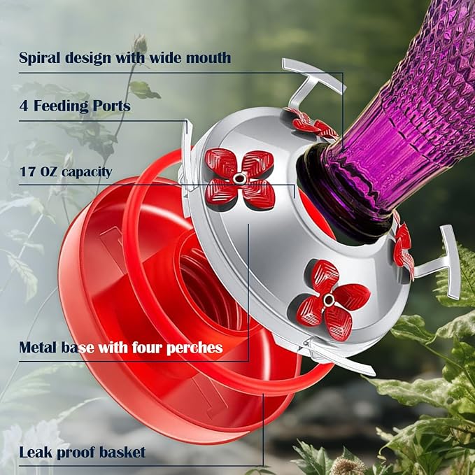 - PACKAGE INCLUDED: 1 pack glass hummingbird feeder, 1 pack ant moat, 1 pack metal hook, and 1 cleaning brush,can meet your daily needs easily.