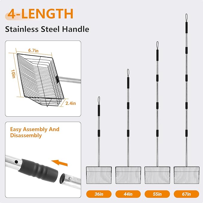 - 【Adjustable Handle Chicken Poop Rake (36", 44", 55", 67")】: Easily adapts to different heights and tasks (chicken coops, sandboxes, dog waste, horse stalls, etc.).The long handle (up to 68") minimizes bending, reducing back strain during cleaning.