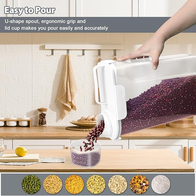 - 🥫【Airtight Seal Rice Storage】The airtight rice storage diepenser with featuring airtight 4 side-locking lid and measuring cup screw on over the pour spout, can protect food from moisture, ants and all bugs, and keep them dry and fresh. Say goodbye to stale and soggy food!