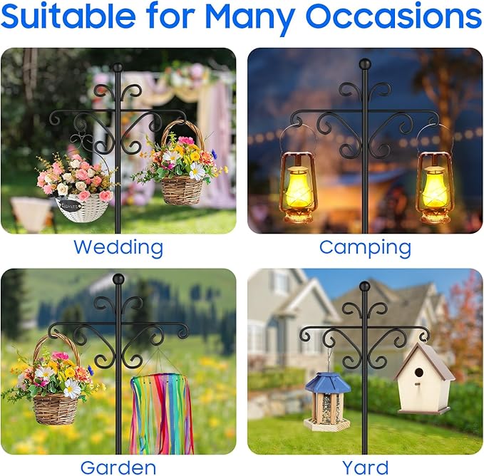 - 【Multi-functional Use】 This shepherd hook is perfect for decorating your garden and courtyard. This adjustable hook can easily hang bird feeding devices, solar lamps, string lights, bird houses, wind chimes, flower POTS and holiday decorations, making it suitable for outdoor occasions.