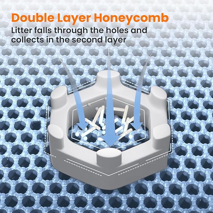 - Double Layer Honeycomb Construction: The extra large litter mat features a honeycomb top that traps all types of litter and lets it fall into the bottom layer for easy collection. Just lift, pour, and reuse—no mess, no hassle. Unlike ordinary mats, ours reduces waste, and makes daily cleaning faster and easier!