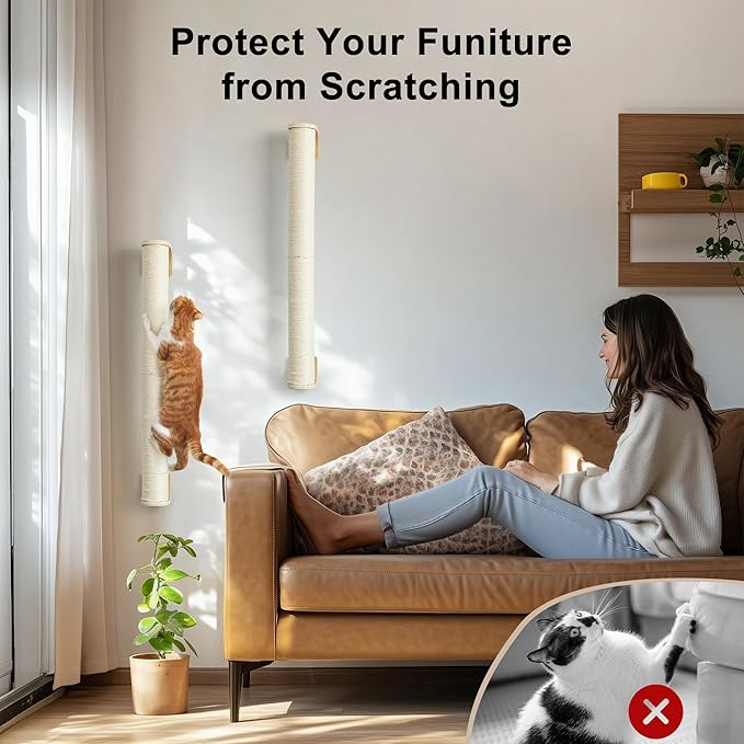 - Space-Saving Design - The cat wall scratch post fits perfectly in tight spots like door frames, window corners, or beside sofas—create cat wall playground while freeing floor space.