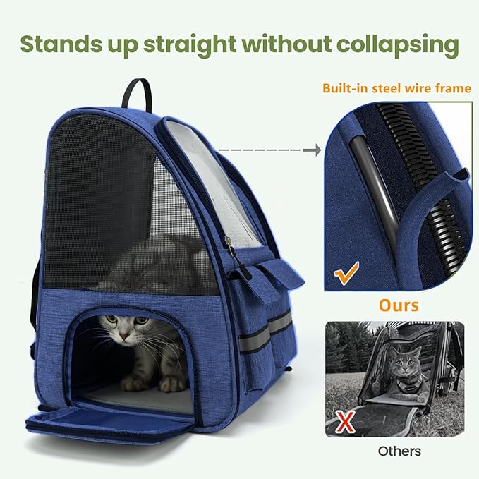 - ROOMY & STORAGE: This cat backpack carrier has a spacious interior that provides plenty of room for your cat to move and stretch. The front pockets can store your cat's toys and snacks so they can have fun anytime, and a side exit allows you to pet your cat at any time