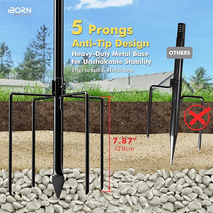 - [Long 5-Prong Pole Stabilizer, catch the ground to keep stable]:Compared to those single feeder stake, iBorn's Bird Bath Pole base with 5 prongs design could hold fast to the ground 20CM (approximately 7.87 inches) LONG bit can get the pole deeper into the earth, spike driven into ground tightly. Securing the center pole into the ground to remain in position, increases Base Stabilization, help the whole bird feeders station keep stable standing without any Leaning or Moving.