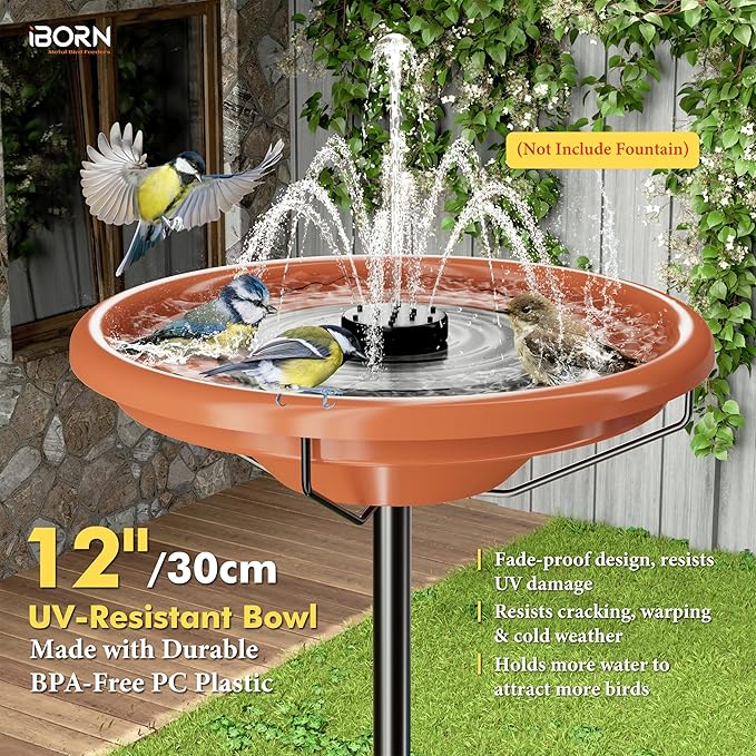 - [This Freestanding Bird Bath Kit Do Not Include Solar Fountain Pump]:Please pay attention before purchasing, this freestanding kit just include 12 inch Bird Bath Bowl,1 Metal Ring Holder,1 inch thickness Pole,3 Pole Sections and 5-Prong Base, DO NOT include any solar-powered fountain pump.