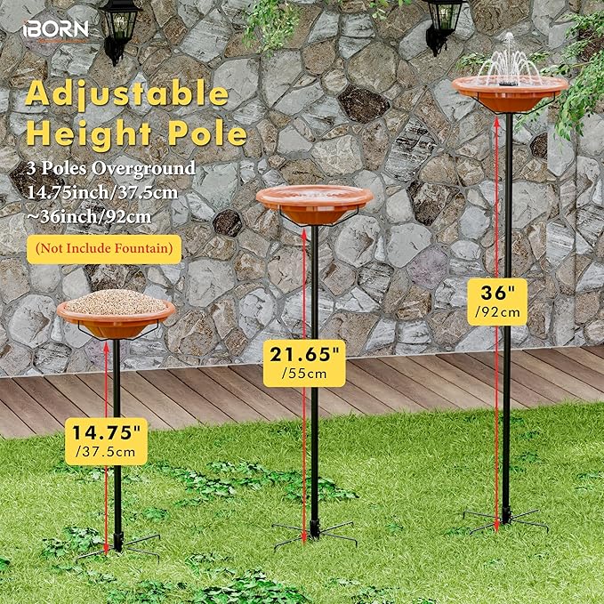 - [Screw-in connections to keep straight,refuse to bend down]:In order to keep the whole freestanding bird bath straight solid standing, iBorn use screw-in thread design to connect each poles sections. The whole 36 Inches(92.5 CM) height bird feeder pole looks like one-piece design without any chink, different from the pop-out clips connect,do not easy to swaying or wobbling. Prefect withstand the windy/rainy or attacked by large birds.