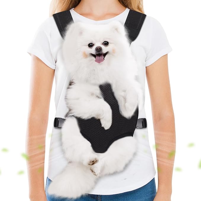 - 【All New Upgtade Dog Front Carrier】Breathable mesh material and legs-out & tail-out design make your pets more cool and comfortable. The widened straps and thickened sponge pads can reduce the pressure on the shoulders, make you feel more comfortable. In addition, built-in safety collar hook, you can buckle it to the dog's collar or harness to prevent pets from accidentally jumping out of the backpack.
