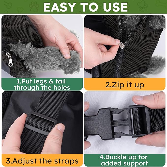 - 【All New Upgtade Dog Front Carrier】Breathable mesh material and legs-out & tail-out design make your pets more cool and comfortable. The widened straps and thickened sponge pads can reduce the pressure on the shoulders, make you feel more comfortable. In addition, built-in safety collar hook, you can buckle it to the dog's collar or harness to prevent pets from accidentally jumping out of the backpack.