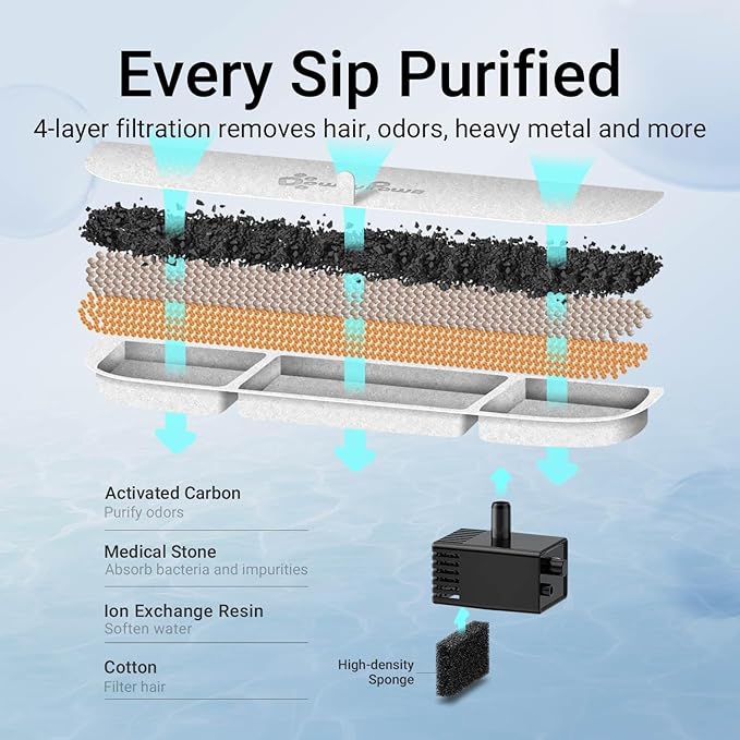 - Enjoy Every Sip of Fresh Water: DownyPaws cat fountains for drinking employs a multi-stage filtration system that effectively removes hair and impurities while releasing trace elements and softening the water to enhance palatability