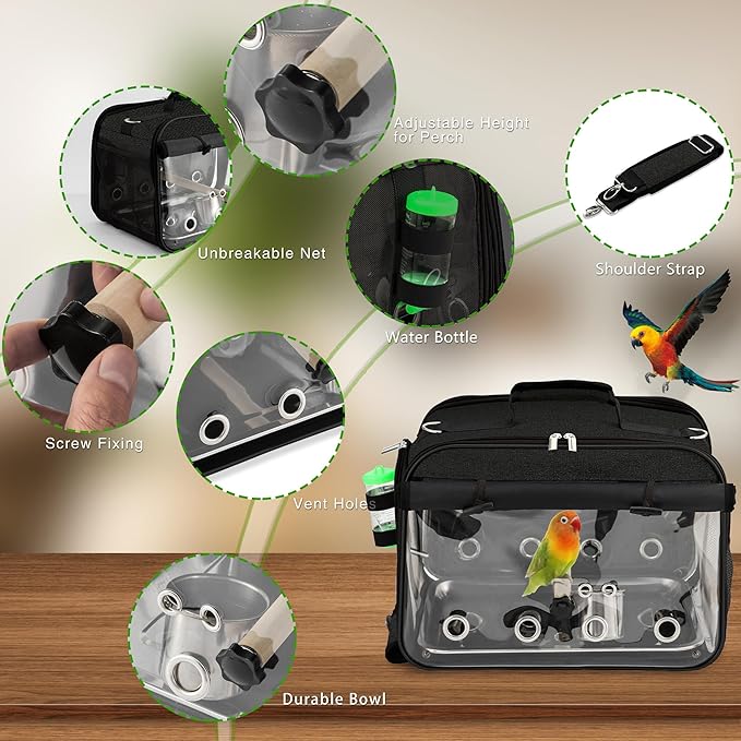 - 【FEEDING & PERCHING】There are a removable bowl, a water bottle and a perch come with the bird carrier. It provides a comprehensive care and comfortable environment for birds even in a long travel.