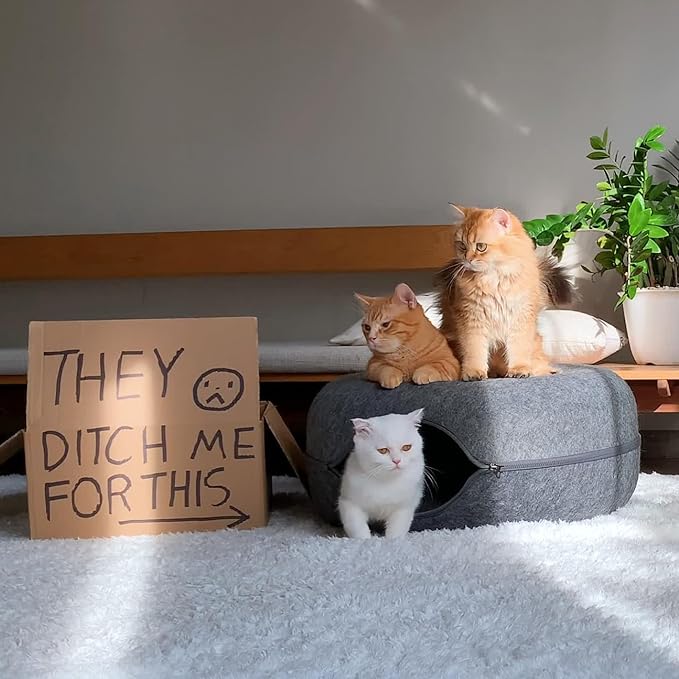 - Durable & Cat-Friendly Design: The Cattasaurus Peekaboo Cat Cave is made from non-toxic, odor-resistant felt that's built to last. It resists pilling and supports safe scratching - perfect as a cat tunnel bed, cat bed cave, or cat scratcher bed. Ideal for all seasons, it offers a snug cat donut bed up top and a comfy cat tunnel below.