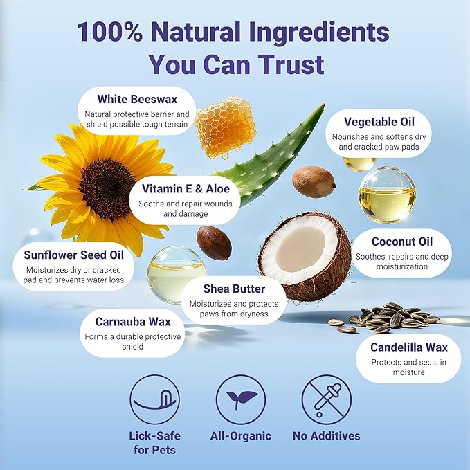 - Lick-safe Natural Ingredients for Safe Use - We use 9 natural ingredients that are lick-safe for pets and work together to nourish and protect. Coconut oil, sunflower seed oil, vegetable oil, and shea butter combine to lock in moisture and heal cracked paws. Natural waxes, including white beeswax, carnauba wax, and candelilla wax, create a protective shield against rough terrain. Enriched with vitamin E and aloe to soothe irritation and accelerate healing of minor wounds.