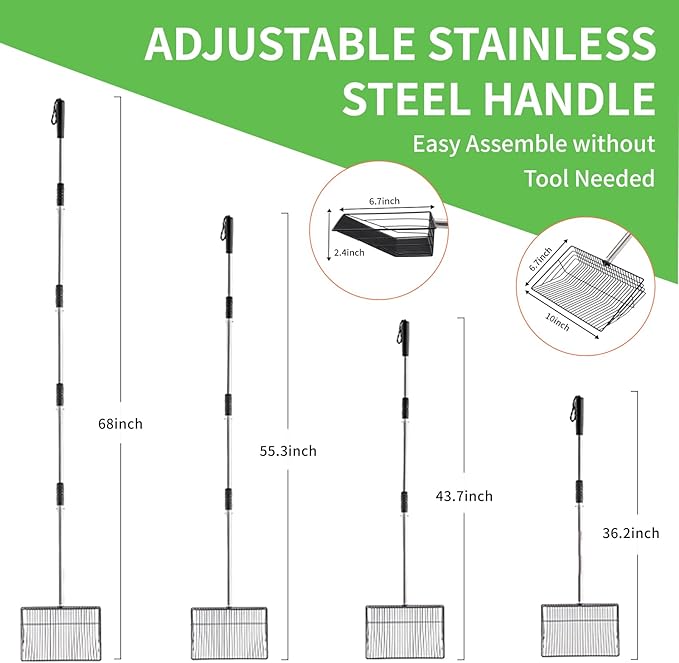 - Ergonomic & Comfortable to Use: Designed for long-term use, this lightweight scooper features an adjustable handle with a soft rubber grip to minimize bending and reduce back strain during cleaning. Whether you're tidying up chicken coops, cat litter boxes, cow pens, or horse stalls, it makes the job easier and more comfortable.