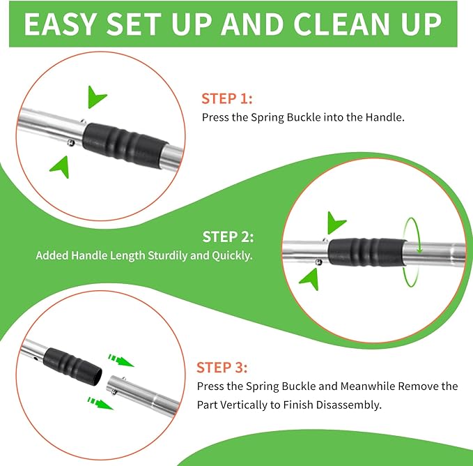 - Adjustable & Durable Stainless Steel Handle: This chicken poop scooper is equipped with a telescoping stainless steel handle that adjusts to four lengths—32", 44", 55", and 67"—for comfortable use in coops of any size. The scoop head is crafted from sturdy iron wire, and the 201 stainless steel handle adds strength and longevity, making it a reliable tool for daily chicken coop cleaning.