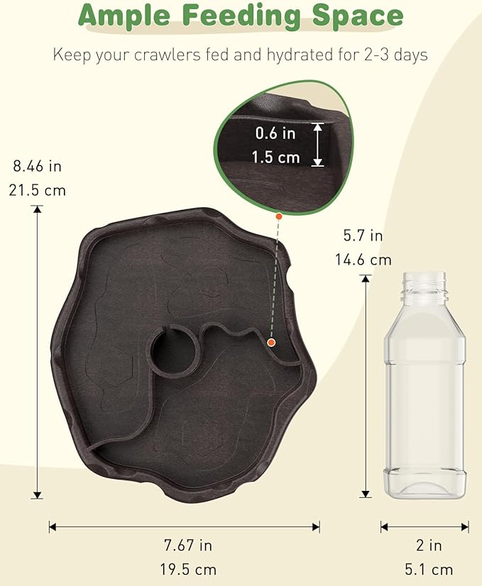 - Dual-Bowl Layout: Overall Size: 8.46" L x 7.67" W x 0.6" D. Spacious turtle feeder with a built-in divider. Great for serving both water and food at the same time! Ample capacity keeps your crawlers fed and hydrated for 2-3 days