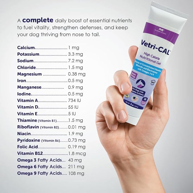 - Complete Nutritional Support A high-calorie gel formulated for both dogs and cats, packed with concentrated vitamins, minerals, electrolytes, and Omega 3-6-9 fatty acids to help support overall wellness, especially during times of stress, recovery, or low energy.
