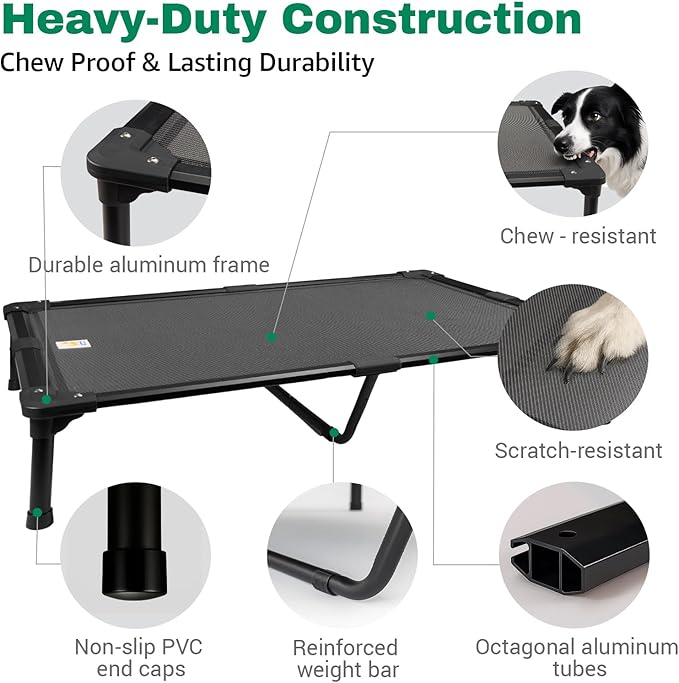 - 🦴 Chew-Proof Aluminum Frame & Premium Teslin Mesh - Crafted with octagonal aluminum tubes, reinforced corners, and premium Teslin fabric, this elevated dog bed is chew-proof, rust-resistant, and built to last. The upgraded Teslin mesh offers superior durability and comfort—ideal for aggressive chewers.