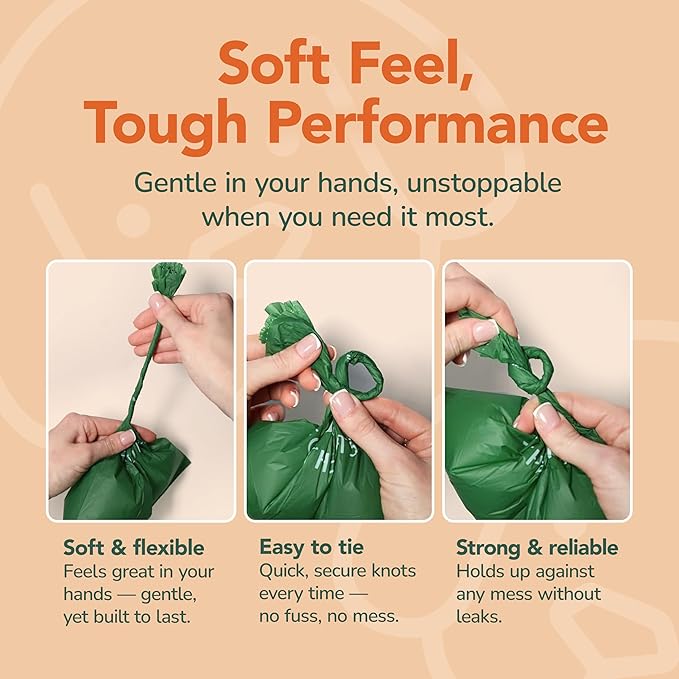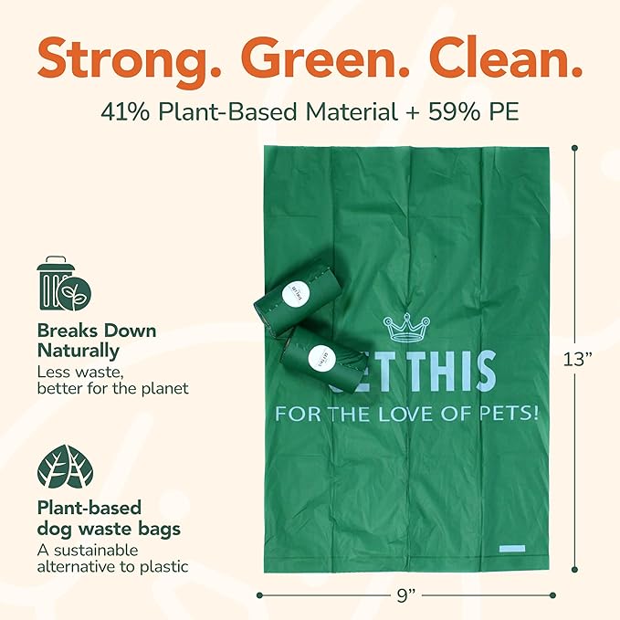 - Eco-Friendly dog bags for pet waste – Made from a compostable corn starch blend, our doggy waste bags help reduce your pup’s carbon pawprint. Perfect alternative for eco-conscious pet parents to traditional plastic poopy bags for dogs