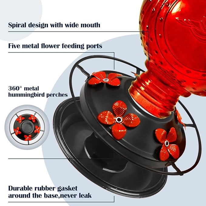 - Vibrant color attract hummingbirds:Crafted with high quality hand-blown vividly colored glass,this bird style glass humming birds nectar container,with 23 OZ large capacity,features five metal flower feeding ports and a built-in ant moat;with 360° metal hummingbird perches,bee and ant proof,ensuring hummingbirds enjoy their meals and play delightfully.