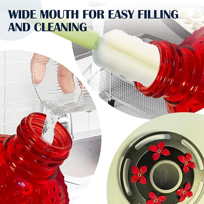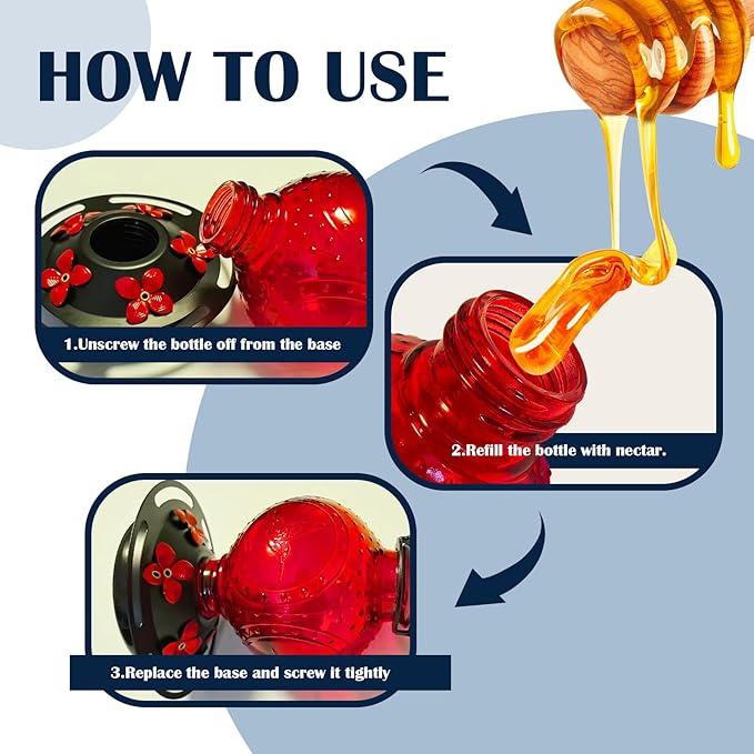 - Easy to clean&refill:Featuring a wide-mouth bottle design,simply screw the container off the rust-resistant metal base for cleaning or refilling,then just tighten the water or nectar-filled container to the base,hang it from trees,shepherd's hooks,hooks.Since there is a piece of durable rubber gasket around the base, fully guarantees its sealing,you don't have to worry about leaking at all.
