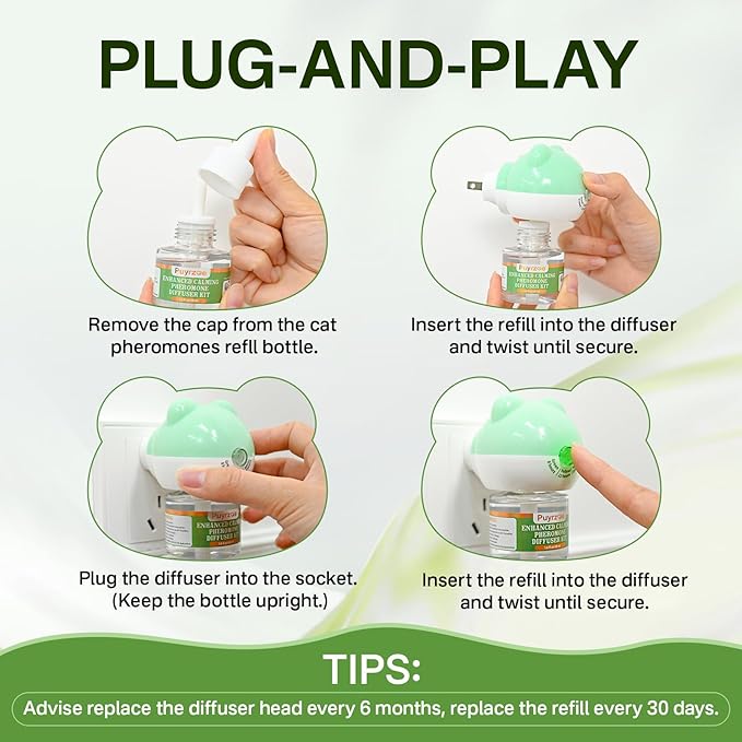 - SAFE FOR CATS AND FAMILY: The Puyrzoe cat calming diffuser features an odorless, non-toxic formula made without artificial fragrances—perfect for households with pets and kids. Inspired by natural feline appeasing pheromones, it gently signals comfort and security to your cat, making it a great choice for cats of all ages.