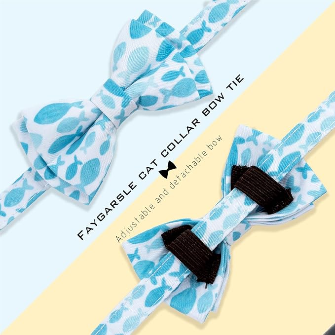 Faygarsle 2 Pack Fish Pattern Cat Collar Set with Bow Tie and Bandana, Light Blue and White, Breakaway Safety Collar with Bell