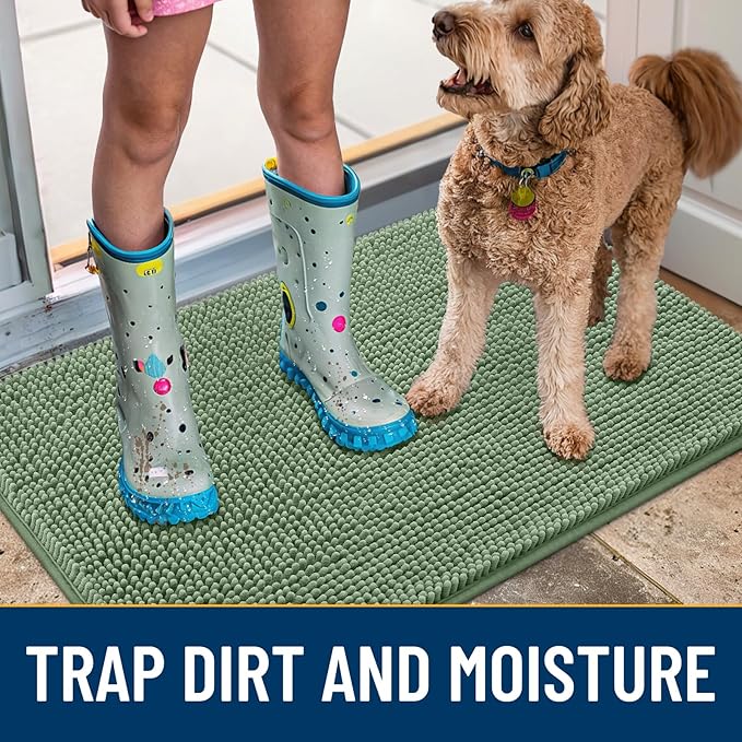 Smiry Dog Door Mat for Muddy Paws 30x20, Absorbs Moisture and Dirt Doormat, Non-Slip Washable Quick Dry Chenille Front Door Mat Indoor Entrance, Entryway Carpet for Inside Floor, Olive Green