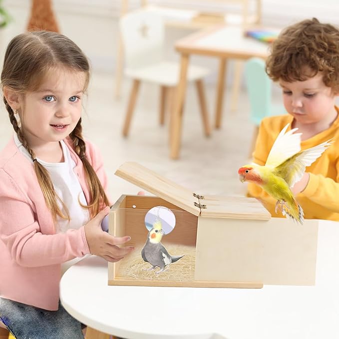 - Natural Material:Cockatiel nesting box made of wood and transparent acrylic with reliable material and transparent view.Breeding box for parrot has excellent heat absorption and cooling effect,warm in winter and cool in summer.Offer ease life for bird