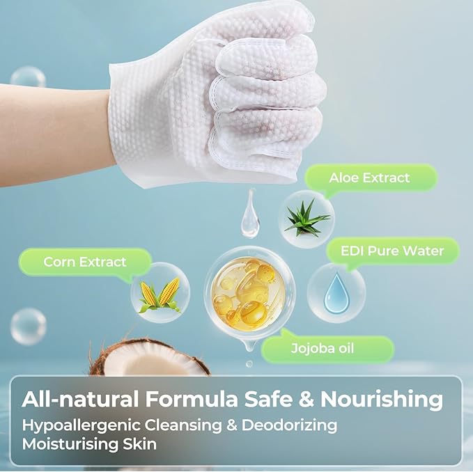 - 🌿 Safe & Nourishing Ingredients: Our pet glove wipes for dogs and cats are crafted with natural, pet-safe ingredients like EDI purified water, organic coconut oil, tea extract, vitamin E, and witch hazel extract. These deodorizing wipes gently clean, nourish, and smooth your pet’s fur while promoting healthy skin. Safe even if licked, they’re perfect for pets with sensitive skin.