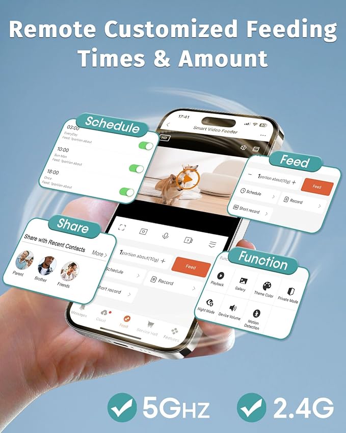 - Smart Feeding with App Control: Control your automatic dog feeder remotely with the “Smart Life” app, connecting seamlessly to 2.4GHz and 5GHz Wifi. Set feeding schedules, adjust portion sizes, and monitor your pet from anywhere. Convenient and easy — perfect for pet owners on the go