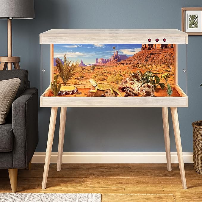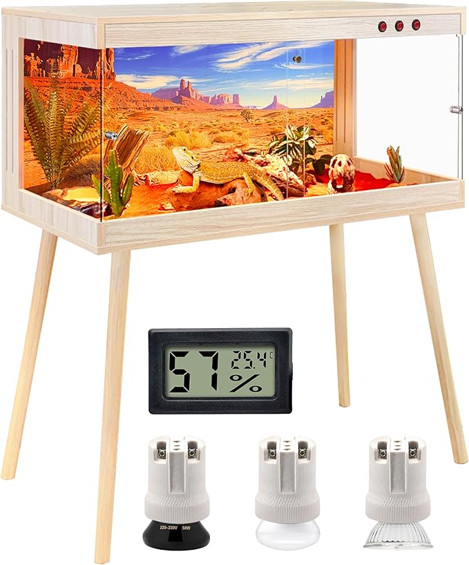 - 【Premium Build & Materials】Expertly crafted with natural wood and tempered glass, this terrarium features a waterproof coating for long-lasting use and a clean, modern aesthetic. The acrylic bottom panel provides reliable moisture resistance, protecting the enclosure from spills and substrate buildup. Its spacious interior allows your reptile to explore, bask, and hide comfortably—encouraging natural behaviors and supporting overall wellness. Available in 4 size options, each unit includes 4 legs; see image 3 for detailed dimensions.