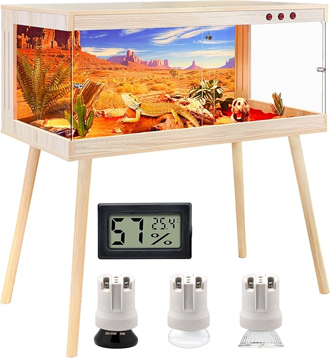 - 【Premium Build & Materials】Expertly crafted with natural wood and tempered glass, this terrarium features a waterproof coating for long-lasting use and a clean, modern aesthetic. The acrylic bottom panel provides reliable moisture resistance, protecting the enclosure from spills and substrate buildup. Its spacious interior allows your reptile to explore, bask, and hide comfortably—encouraging natural behaviors and supporting overall wellness. Available in 4 size options, each unit includes 4 legs; see image 3 for detailed dimensions.