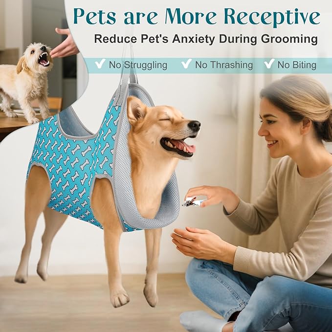 - 【Dog Hammock for Nail Trim】dog hanging harness for nail trimming helps you easier accomplish grooming your cute pet at home such as trimming nails, grooming, bathing, eye & ear health care, injections, checking various body indicators, etc. This restraint dog grooming bag can also help you bathe and clean your dog when dogs after traveling. It's so comfortable and relaxing which makes your pet love it. Grooming hammock for small Dogs is also a good helper for vets.