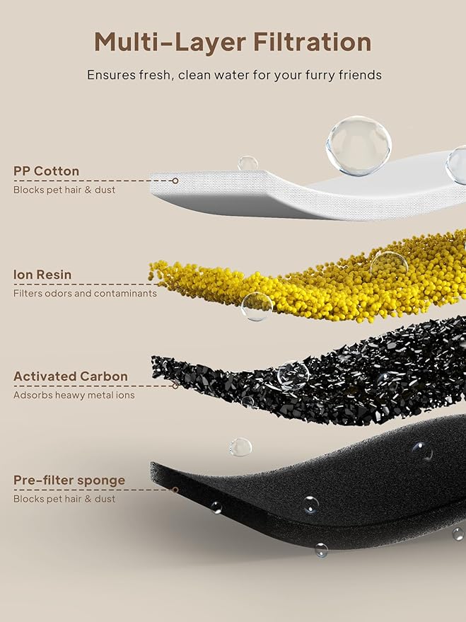 - 【4-Layer Vertical Filtration】With VOLUAS new version filter, it increases the amount of filtration material and has better filtration. One-way circulation filtration ensures thorough purification, providing pure and fresh water for your furry friends.(The filter element needs to be replaced regularly)