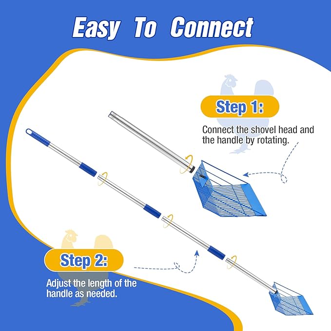 - Easy to Install and Clean - This chicken poop scrooper is very easy to install, the head and handle are connected by a simple swivel thread for a sturdy and stable construction. The stainless steel sifting shovel is very easy to clean, just rinse it with a faucet.