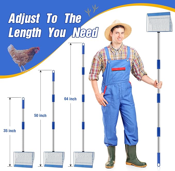 - Adjustable Stainless Steel Long Handle - This chicken poop scooper can be adjusted to 3 lengths: 35", 50", 64". You can adjust it to a comfortable length as needed to relieve your hands and back and make cleaning easy.