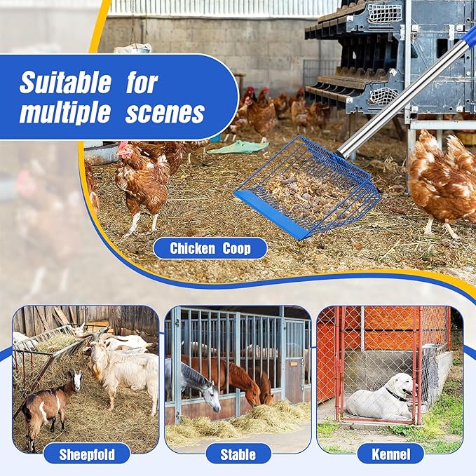 - Suitable for Multiple Scenarios - This multifunctional sifting shovel has various uses. It can not only be used to clean chicken coops/sheep pens/stables/dog houses, but also to clean sandboxes, shovel hay and straw. The sturdy structure and ingenious design enable it to handle different types of work very well.