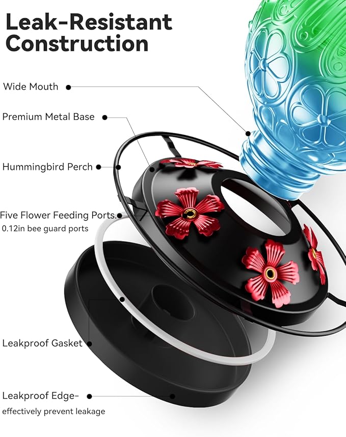 - Durable & Spill-Resistant – Equipped with a built-in gasket and seamless base, this hummingbird feeder is designed to minimize spills and nectar waste. Its sturdy construction ensures stable placement on balconies, patios, gardens, or outdoor spaces, offering hummingbirds a reliable feeding spot.