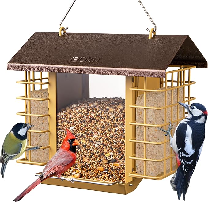 - [Large Weatherproof Metal Roof - Keeps Seeds Dry & Fresh] iBorn Bird Feeder for Outdoors features a weatherproof roof that prevents rain and snow from entering, ensuring seeds stay dry and fresh. No more moisture-induced clumping — fewer refills and less maintenance save you time and money. Watch cheerful birds happily feeding in all kinds of weather — no soggy mess, just pure joy. With our feeder, you're not just feeding birds — you're creating peaceful moments and bringing your yard to life.