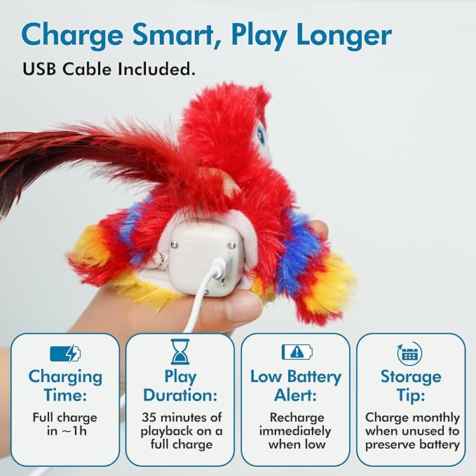 - 【Flapping Bird Cat Toy】The Bird Does Not Fly! Make play fantastic with the touch-activated cat bird toy, which makes lifelike chirping sounds and flapping once playtime begins, beckoning every cat, bite, chew, and chase! Every 20 seconds of operation, chirping bird cat toy will automatically stop, it can be restarted by beating the bird's wings.