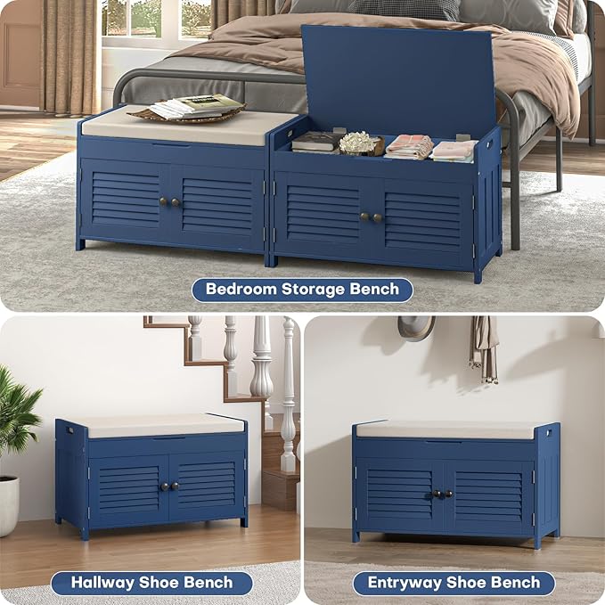 - MODERN STORAGE BENCH FOR ANY SCENE: A neutral color matching plus louvered design door will add stylish look to your home. Breathable cabinet doors, cushion seating and storage in one feature is very suitable to as a shoe bench for entryway, a storage bench for closet room, or a storage chest in end-of-bed.