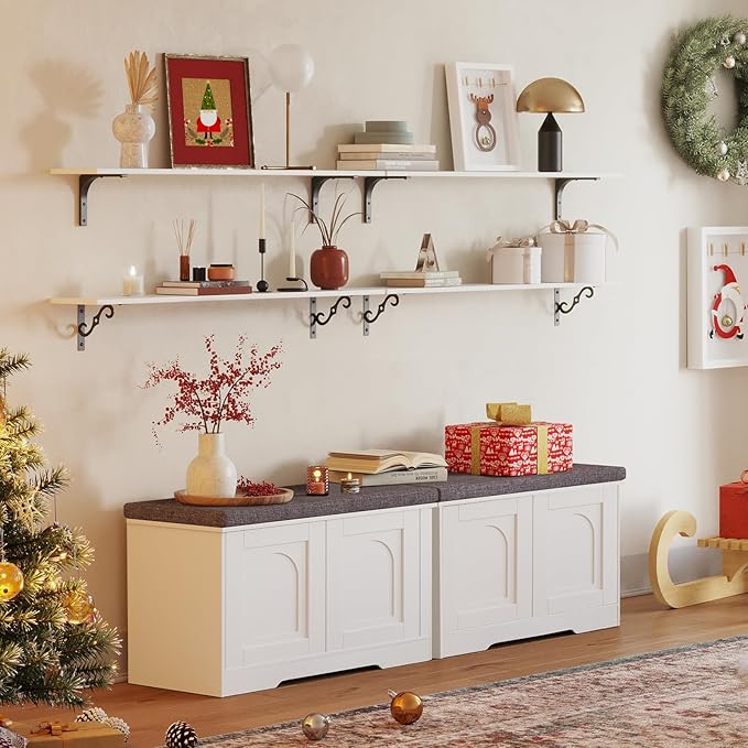 DINZI LVJ Shoe Bench, Entryway Storage Bench with Doors, Cushion, 2-Tier Shoe Rack with 6-Cubby, 31.5”L x 13.8”W Shoe Organizer Cabinet, Adjustable Shelf, Living Room, Bedroom, White