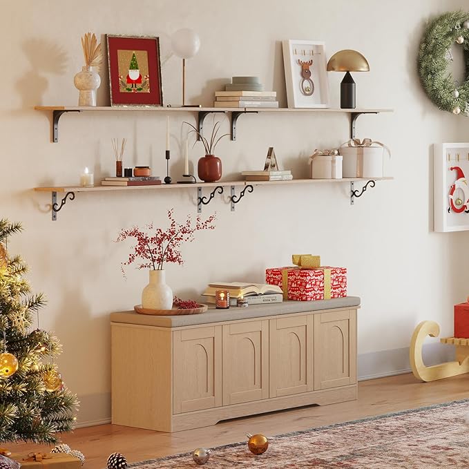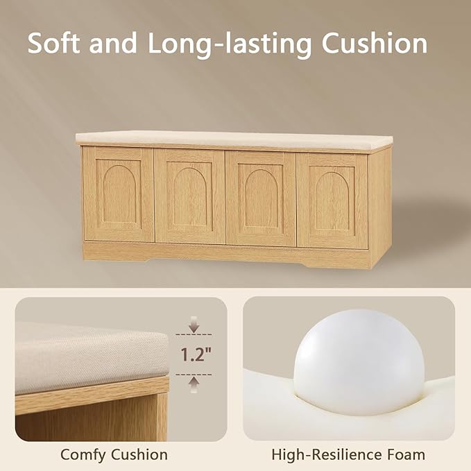 DINZI LVJ Shoe Bench, Entryway Storage Bench with Doors, Cushion, 2-Tier Shoe Rack with 8-Cubby, 47.2”L x 13.8”W Shoe Organizer Cabinet, Adjustable Shelf, Living Room, Bedroom Natural
