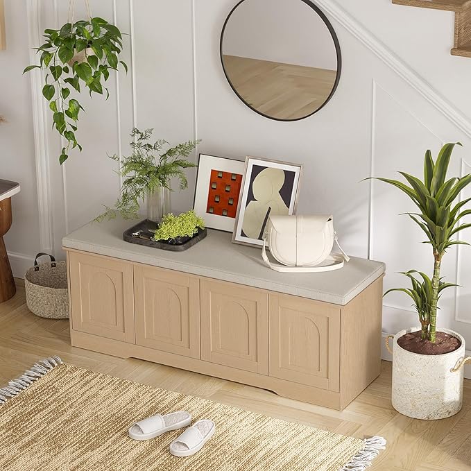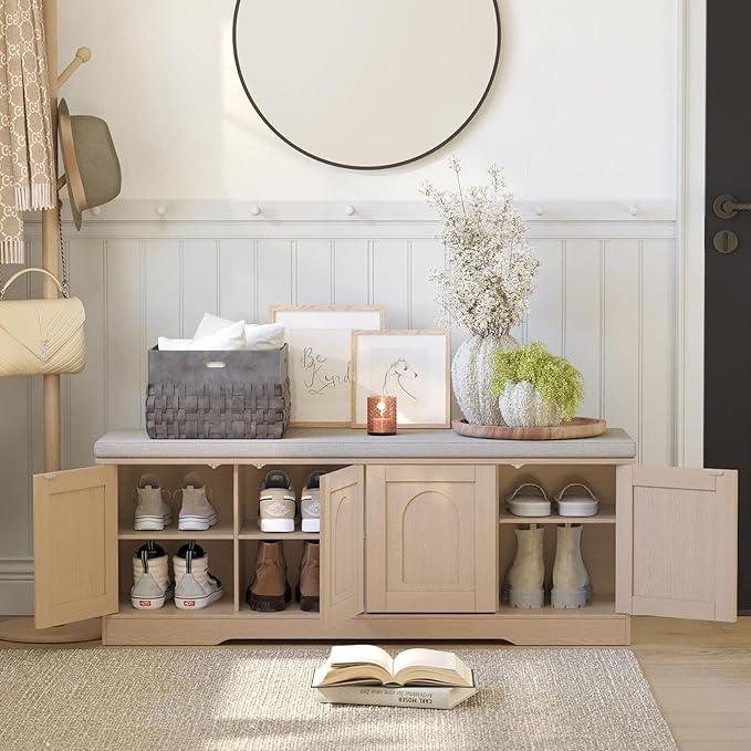 - 【Effortless Push-to-open door】Feature a fully enclosed design with a press-to-open mechanism, keeping shoes clean and tidy while avoiding accidental bumps against door handles during use. Reasonable height and soft cushion let you change shoes by sitting on the bench more comfortable without bending down or squatting
