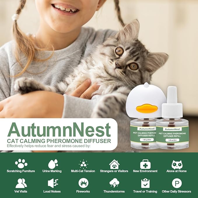 - 【6 IN 1 Effective Cat Calming Diffuser】AutumnNest cat pheromone diffuser mimics maternal signals to soothe cats, easing behaviors like scratching, fighting, hiding, and excessive meowing.
